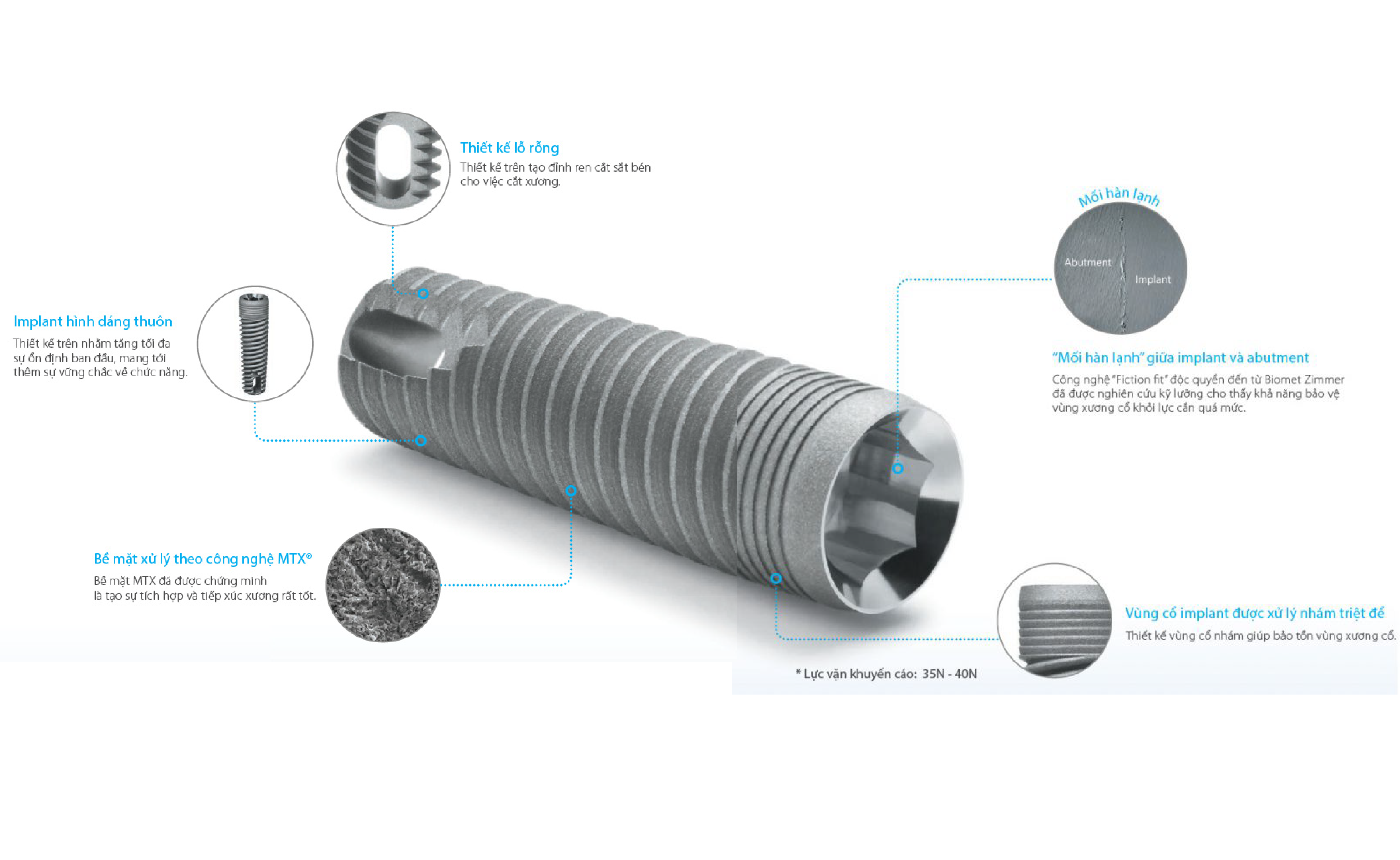 - Kết nối giữa implant và abutment tạo góc nghiên hướng vào bên trong nhằm giảm tải lực theo chiều ngang, và điều này đã được chứng minh là chịu lực tốt hơn những loại cổ có bề mặt ngang thông thường